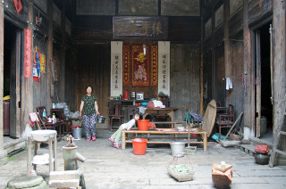 Anschließend fahre ich nach Wangkou, einem über 1000 Jahre alten Dorf, ungefähr 20 km östlich von Wuyuan, mit märchenhaften, alten Holzhäusern in einer malerischen Gegend. Ich besuche eine Grundschule, alte Häuser, die scheinbar schon lange nicht genutzt werden, in denen aber noch die Drachen der Drachentänze stehen und alte Bilder hängen. Außerdem pflüge ich einen Teil eines Feldes mit einem Wasserbüffel, dem es scheinbar egal ist, wer da hinter ihm hergeht.