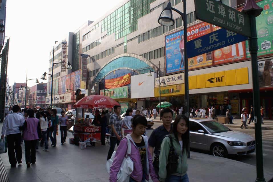 Gleich hinter dem Renmin Guangchang geht rechts die Qongqing Lu, eine moderne Einkaufsstraße, die wir “Klatschstraße” nannten, weil vor den Läden zumeist jugendliche Leute standen, die nichts weiter machten, als in die Hände zu klatschen, um die Aufmerksamkeit der Passanten auf den Laden zu lenken. Auch vom Renmin Guangchang geht die Changchun Dalu ab, in der der schöne Banruosi-Tempel liegt.