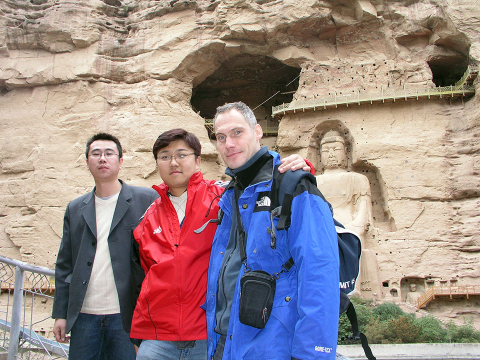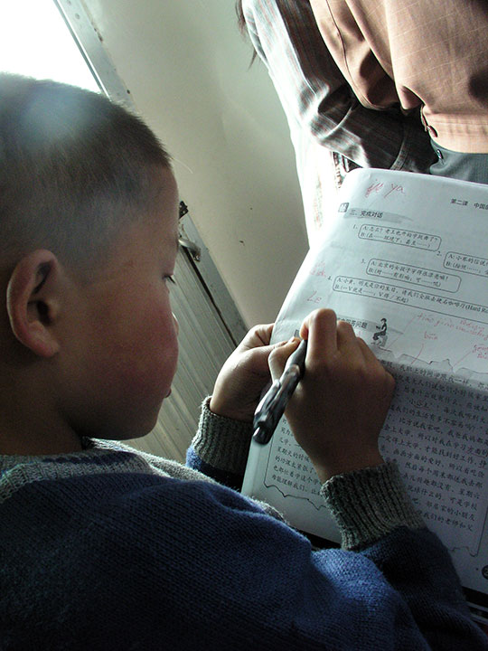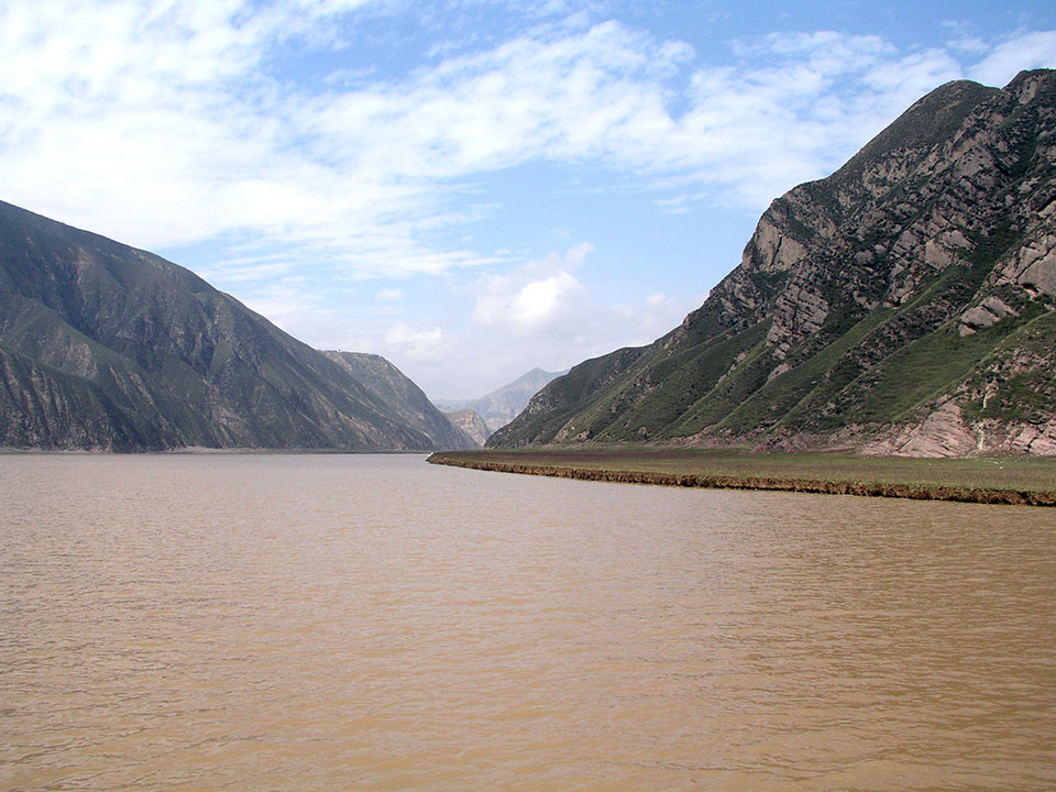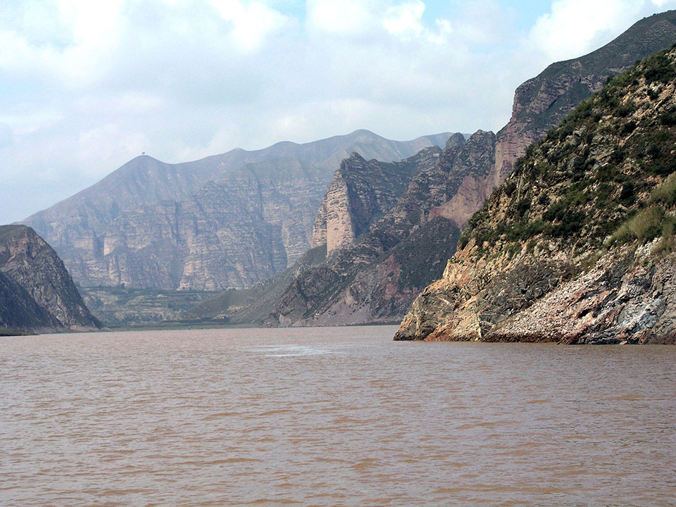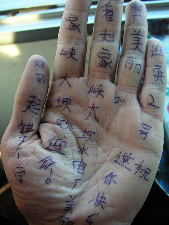 Ich fuhr den Gelben Fluss herunter zu einer Stätte mit jeder Menge Buddhastatuen. Es ist eine verkarstete Lössgegend. Der Fluss ist gelb, weil sich das Löss im Wasser löst. Ich verbrachte den längsten Teil der Reise oben auf der Brücke beim Kapitän und seiner Familie. Der Sohn schrieb mir mit Kugelschreiber einen Gruß auf meine Hand.