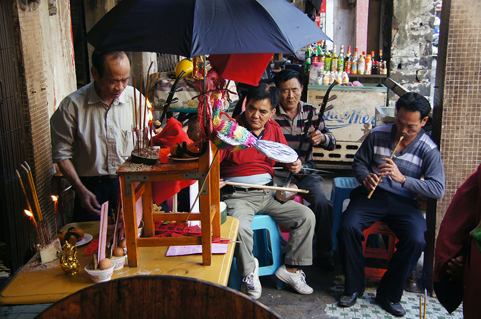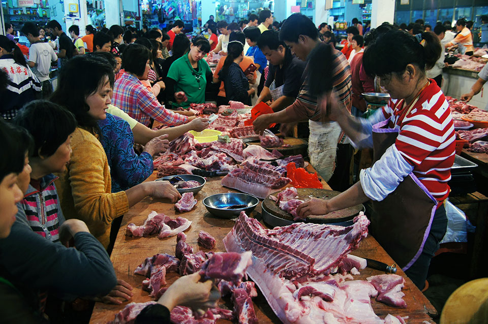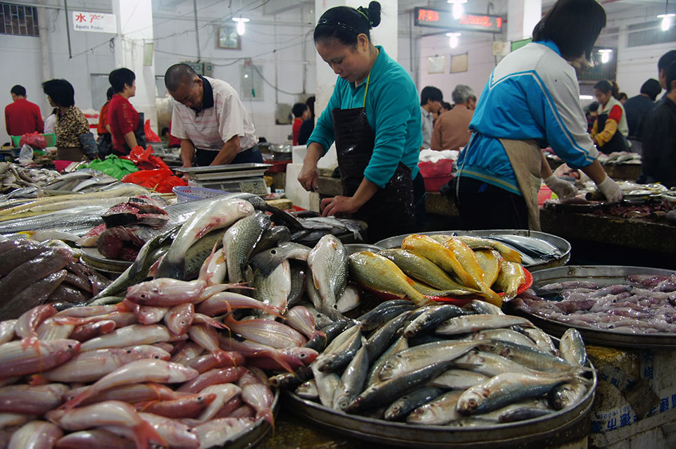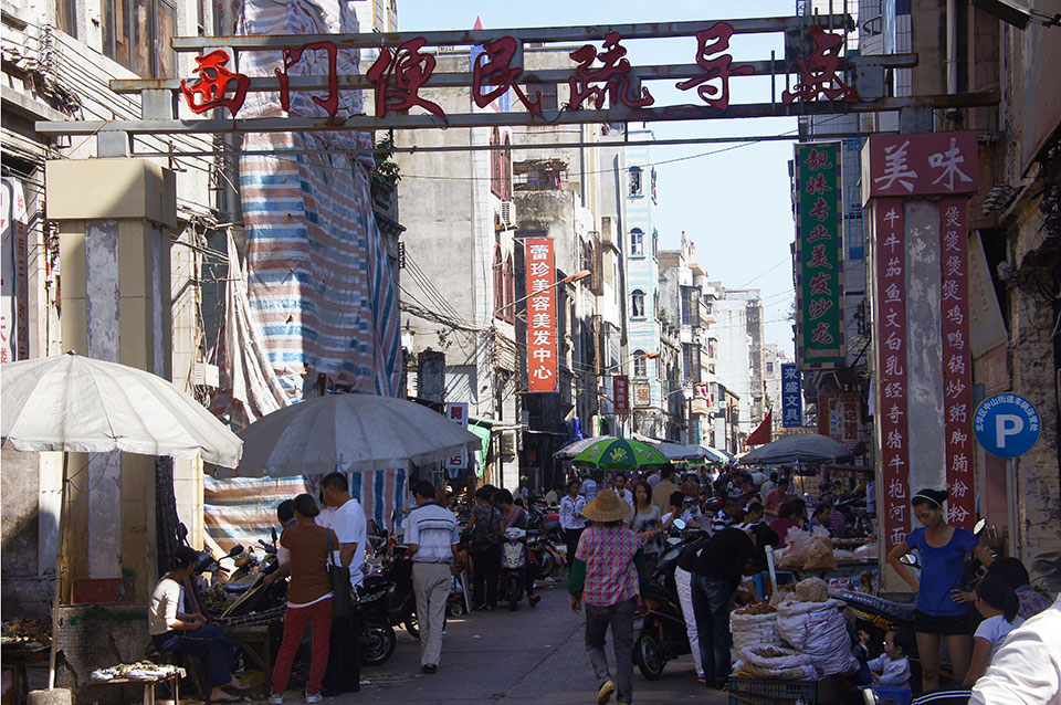 In Haikou besuche einen tollen Fischmarkt und später einen riesigen Markt, auf dem man Haie, Schildkröten, Schlangen und so kaufen kann. Da viele Leute ihr Fleisch möglichst frisch kaufen wollen, werden die Tiere lebendig verkauft, zumeist unter furchtbaren Bedingungen. In dem Menschengewimmel stehe ich manchmal minutenlang im Stau. Später komme ich an einem Laden vorbei, in dem eine kleine Band und ein paar Schauspieler eine chinesische Oper vorspielen. Irgendwann gehen die Zuschauer in einer Schlange durch den Laden und legen Geld in eine Schüssel.