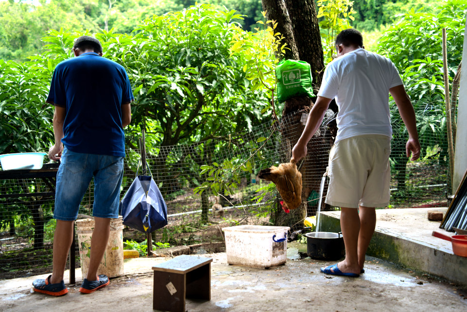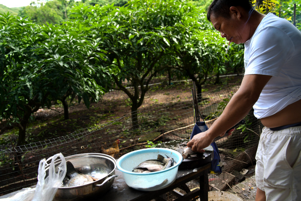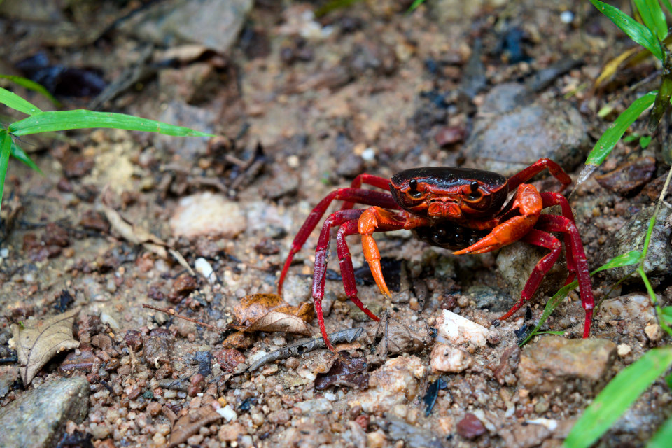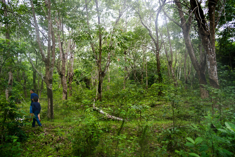 Vorbei an einer riesigen Spinne, Gummibaumplangen und einem Krebs, der, nach unserem einheimischen Guide, auf dem Trockenen lebt. Diesmal ist mein großer Sohn dabei. Beim Essen schlägt er sich großartig, probiert, was sie ihm geben, dann spielt er mit einer Machete und einer Säge und einem Stapel Holz.