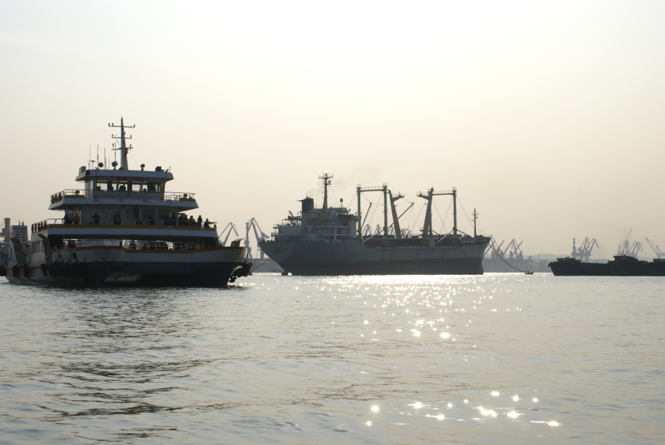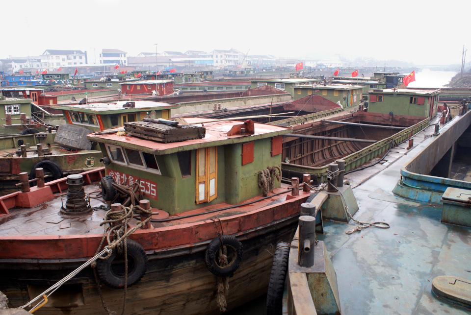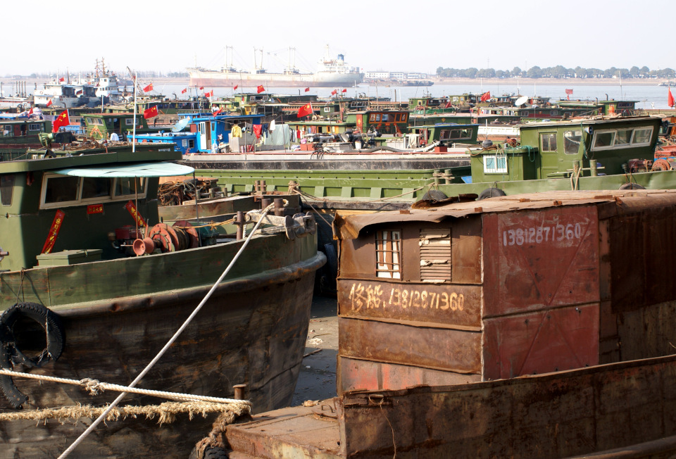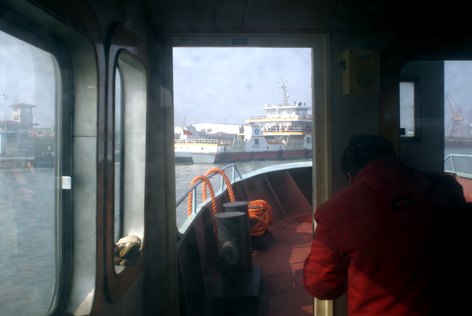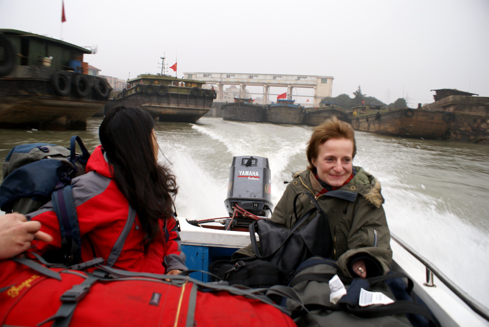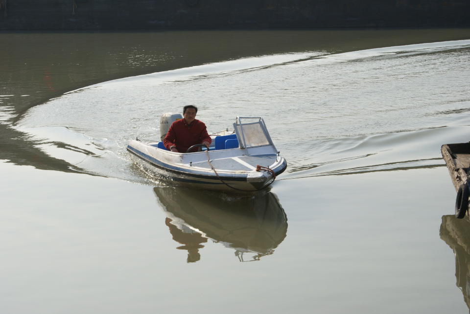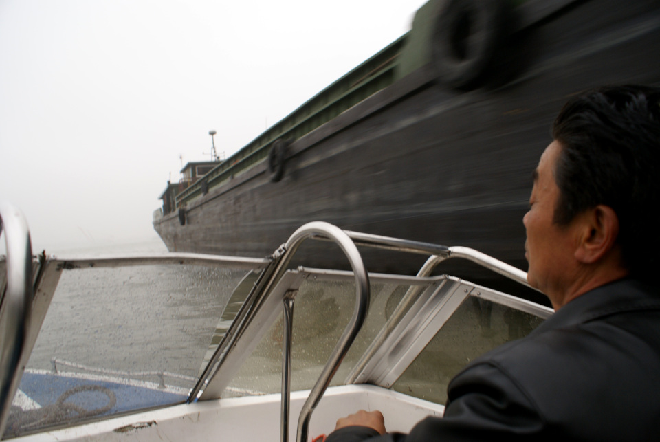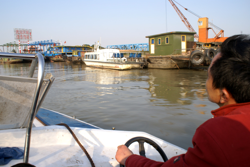 Die Familie wohnt auf einer Insel im Jiangtse Fluss. Ankunft und Abfahrt waren außerhalb der offiziellen Fährenzeiten, also mussten wir jeweils ein kleines Boot mieten. Da ich auch gerne einmal ein solches Boot steuern wollte, bat ich den Kapitän, mir das Steuer zu geben. Ohne eine Überlegung lässt er mich ans Steuer. Das macht so viel Spaß, dass wir gleich noch eine kleine Hafenrundfahrt machen.