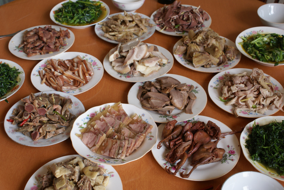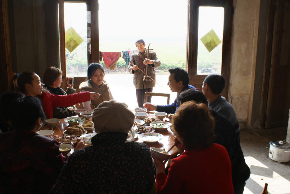 Das traditionelle Essen dort ist sehr fleischlastig, es gibt fast nichts Grünes und vor allem kein frisches Gemüse oder Salat. Während des Essen kam ein Musiker an dem Haus vorbei und spielte auf einem chinesischen Instrument.