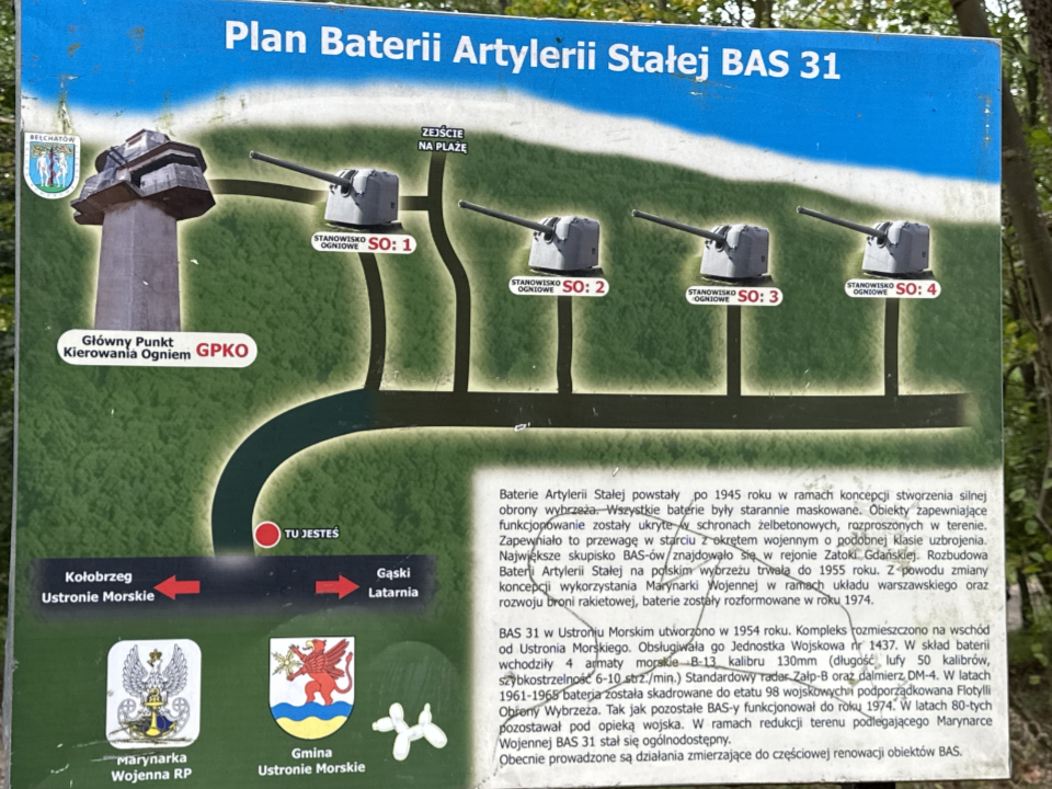 Etwas östlich von Kolobrzeg ist Ustronie Morskie, eine kleinere Stadt, die noch mehr Flair aus den alten Tagen hat. Dort besuchen wir einen ruinösen Artelleriestützpunkt aus dem 2. Weltkrieg, mitten im Wald.