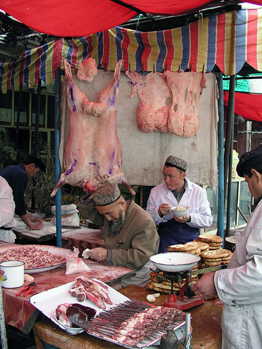 Im Mai 2004 bin ich nach Urumuqi geflogen und von dort mit dem Zug nach Kashgar gefahren. Im Zug sprachen mich zwei Studentinnen an, eine Russin aus Estland und eine Amerikanerin mit koreanischen Wurzeln. Sie hatten gehört, dass es in Xinjiang für ausländische Frauen gefährlich sein sollte und so haben wir uns zusammengetan. Abends sind wir in das erste beste Restaurant gegangen und, da wir nicht wussten, was man da so essen konnte, gingen wir zum Nachbartisch, an dem eine ganze Reihe uigurischer Frauen wild am feiern war, um zu gucken, was die so aßen, um uns vielleicht das gleiche zu bestellen. Sofort mussten wir uns hinsetzen und dann begannen die Frauen, noch einmal neu zu bestellen. Es gab eine wilde Feier und wir mussten irgend so einen uigurischen Volkstanz tanzen. Kashgar hat einen eindrucksvollen Viehmarkt. Uiguren sind Turkmenen, Muslime und sie haben ihre eigenen Bräuche und Kultur.